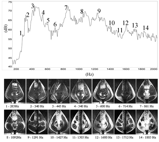 Ιδιαίτερα χρήσιμη είναι επίσης η απεικόνιση των μορφών των τρόπων συντονισμού του οργάνου. Αυτό επιτυγχάνεται σήμερα με τη μέθοδο της ηλεκτρονικής συμβολομετρίας ψηφίδων (ESPI). Με τη χρήση λέιζερ, ψηφιακών φωτογραφικών μηχανών, ηλεκτρονικών υπολογιστών και σχετικών λογισμικών, καταγράφονται οι μορφές και το εύρος δόνησης του οργάνου. Αυτά αποδίδονται ως εικόνα με διαβαθμίσεις του γκρι, όπου οι σκοτεινές περιοχές έχουν τη μέγιστη δόνηση και οι φωτεινές την ελάχιστη. Το εύρος δόνησης αποδίδεται μέσω της πυκνότητας των ζωνών: η έντονη δόνηση παράγει μεγάλη πυκνότητα σκοτεινών καμπυλών, ένα είδος δηλαδή υψομετρικών καμπυλών του πλάτους της δόνησης. Αυτό βοηθά να κατανοήσουμε τον τρόπο που παράγει τον ήχο κάθε όργανο. Βοηθά ακόμη να εντοπίσουμε τα χαρακτηριστικά που διαφοροποιούν τα όργανα τα οποία κατηγοριοποιούνται από τους εκτελεστές τους ή το κοινό ως καλά όργανα, από άλλα που χαρακτηρίζονται κακά. Μία αξιόλογη πρωτότυπη τέτοια εργασία για τη λύρα είναι αυτή του Λ. Χαρτοφύλακα (2007) υπό την επίβλεψη του Ν. Παπαδογιάννη.