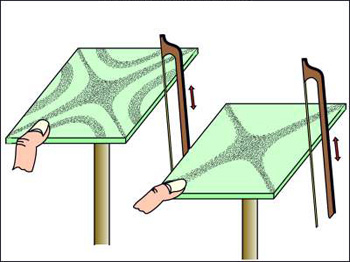 Αν προσπαθήσουμε να διεγείρουμε αντί για ράβδο μία ξύλινη πλάκα, διαπιστώνουμε μία αντίστοιχη συμπεριφορά. Τώρα όμως οι κόμβοι διατάσσονται στην επιφάνεια της πλάκας κατά μήκος καμπυλών, τις κομβικές γραμμές, και για να περιγράψουμε κάθε τρόπο συντονισμού, πέρα από την ιδιοσυχνότητα, τη στάθμη και το εύρος του, χρειαζόμαστε και τη μορφή του στο χώρο, ένα χάρτη δηλαδή των περιοχών που δονούνται και αυτών που δεν δονούνται.